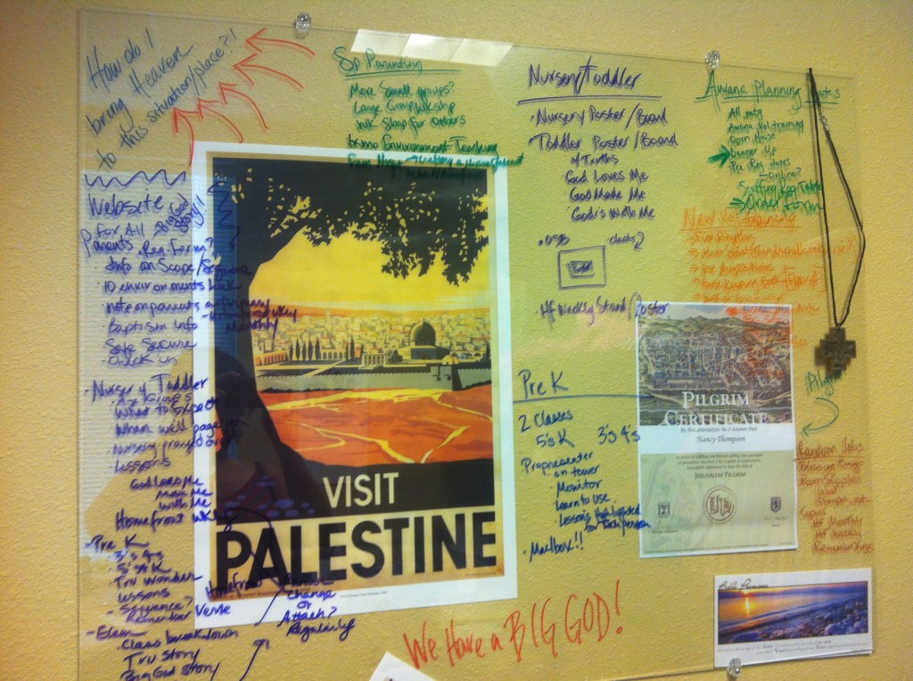 So here’s what I did: I made a glass board. I got a large piece of glass, a little package of mirror mounts from a hardware store, and installed it on my wall. Okay, you’re thinking, “sure, large pieces of glass are just super easy to come by”. Well, kinda. I actually went on safari in our church basement and found some large pieces of “art” that had been donated when a hotel closed. So imagine budget hotel art from the eighties. We weren’t going to use the picture, but I sure could use pieces. I used the frame for a different project I’ll share about another time. I was left with this huge piece of glass. So look around your space and see if there are things you can “repurpose”. Or ask others. Or check garage sales.